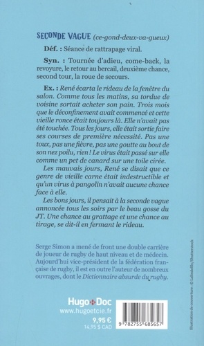 Cent définitions qui, sous l'apparence de la légèreté, nous font réfléchir sur la période que nous avons vécue. Anosmie, Cluster, Ecouvillon, Quatorzaine, Sérologie, mais aussi Attestation, Caissière, Expert, Masque, Monde d'avant, Soignant, Télétravail et bien sûr Raoult, Salomon, Véran, Wuhan et Pangolin : avec l'irruption du Covid-19, notre vocabulaire a basculé en même temps que nos vies et une novlangue déroutante a envahi nos conversations, ou du moins ce qu'il en restait. Serge Simon revient sur les cent mots qui nous ont tenu compagnie pendant le confinement. Pour exorciser, pour en rire et aussi pour réfléchir, un peu. EXEMPLE DE DEFINITION : Confinement (kon-phi-ne-man) : nom, masc. Déf : Comportement humain collectif, respecté par toutes et par tous, basé sur le civisme et l'intérêt général, visant à casser la chaîne de transmission d'un virus. Pour beaucoup ce fut l'occasion d'une introspection permettant un retour aux valeurs essentielles de la vie. Syn : La taule, le placard, perpète, la zonzon, Cayenne, le château d'If, Alcatraz, non pas ça ! Ex : Durant le confinement, René sortait tous les jours en loucedé pour aller boire l'apéro chez Raymond. Pas d'attestation, pas de masque et surtout en guise de bonjour, une belle main au panier de Simone, la dernière conquête de Raymond qui sentait le cul à plain naseaux. Coronavirus ou pas, René n'envisageait pas une seule seconde de déroger à la seule règle qu'il avait respectée depuis l'âge de 14 ans : " Midi c'est un demi ! Midi et quart, c'est un Ricard ! " SOMMAIRE NON EXHAUSTIF Agueusie - Anosmie - Anticorps - Apéro digital - Attestation de sortie - Ballon - Bolsonaro - Buzyn - Caissière - Cellophane - Chloroquine - Cluster - Conf call - Confinement - Conseil scientifique - Contact - Contamination - Coronanisme -Coronavirus - Courses de première nécessité - Déconfinement - Dépistage - Distanciation Sociale - Distanciel - Eboueur - Ecouvillon - Embrassade - EPHAD - Espagne - Expert - File d'attente - Gel hydroalcoolique - Gestes barrières - Iran - Italie - Johnson - JT - Lavage des mains - Macron - Masque - Monde d'après - Monde d'avant - Nasopharyngé - Pangolin - Passe - PCR - Plage dynamique - Plexiglas - Première ligne - Présentiel - Quarantaine - Quatorzaine - Raoult - Règles sanitaires - Salomon - Seconde ligne - Sérologie - Service de réa - Skypapéro - Sibeth - Soignant - Sport collectif - Sport de combat - Teams - Télétravail - Trump - Vaccin - Véran - Vidéoconférence - Virus - Wimi - Wuhan - Zone rouge - Zone verte - Zoom - 1, 5 m - 4 m2 - 10 m