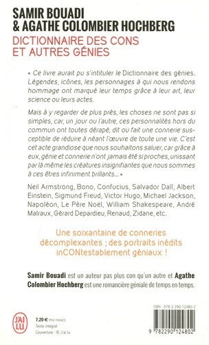 "Ce livre aurait pu s'intituler le Dictionnaire des génies. Légendes, icônes, les personnages à qui nous rendons hommage ont marqué leur temps grâce à leur art, leur science ou leurs actes. Mais à y regarder de plus près, les choses ne sont pas si simples, car, un jour ou l'autre, ces personnalités hors du commun ont toutes dérapé, dit ou fait une connerie susceptible de réduire à néant l'ouvre de toute une vie. C'est cet acte grandiose que nous souhaitons saluer, car grâce à eux, génie et connerie n ont jamais été si proches, unissant par là même les créatures insignifiantes que nous sommes à ces êtres infiniment brillants..." Neil Armstrong, Bono, Confucius, Salvador Dalí, Albert Einstein, Sigmund Freud, Victor Hugo, Michael Jackson, Napoléon, Le Père Noel, William Shakespeare, André Malraux, Gérard Depardieu, Renaud, Zidane, etc. Une soixantaine de conneries décomplexantes ; des portraits inédits inCONtestablement géniaux !