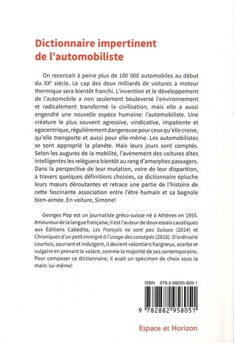 On recensait à peine plus de 100'000 automobiles au début du XXe siècle. Le cap des deux milliards de voitures à moteur thermique sera bientôt franchi. L'invention et le développement de l'automobile a non seulement bouleversé l'environnement et radicalement transformé la civilisation, mais elle a aussi engendré une nouvelle espèce humaine : l'automobiliste. Une créature le plus souvent agressive, vindicative, impatiente et egocentrique, régulièrement dangereuse pour ceux qu'elle croise, qu'elle transporte et aussi pour elle-même. Les automobilistes se sont approprié la planète. Mais leurs jours sont comptés. Selon les augures de la mobilité, l'avènement des voitures dites intelligentes les relèguera bientôt au rang d'amorphes passagers. Dans la perspective de leur mutation, voire de leur disparition, à travers quelques définitions choisies, ce dictionnaire épluche leurs moeurs déroutantes et retrace une partie de l'histoire de cette fascinante association entre l'être humain et sa bagnole bien-aimée. En voiture, Simone !