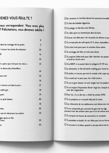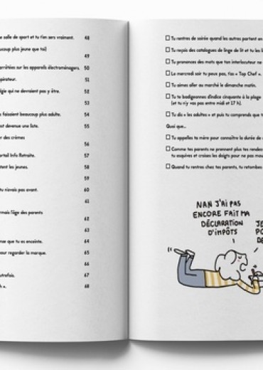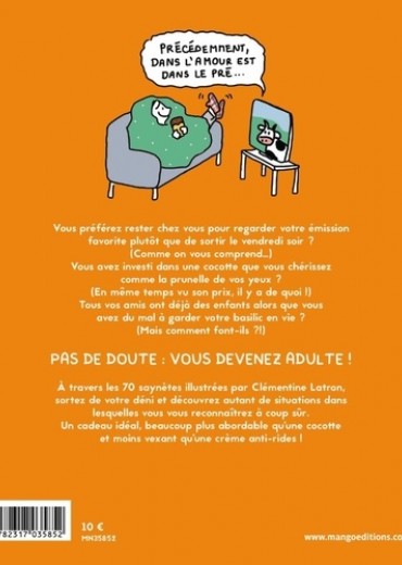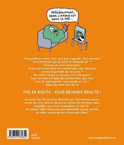 Vous préférez rester chez vous pour regarder votre émission favorite plutôt que de sortir le vendredi soir ? (Comme on vous comprend...) Vous avez investi dans une cocotte que vous chérissez comme la prunelle de vos yeux ? (En même temps vu son prix, il y a de quoi ! ) Tous vos amis ont déjà des enfants alors que vous avez du mal à garder votre basilic en vie ? (Mais comment font-ils ? ! ) Pas de doute : vous devenez adulte ! A travers les 70 saynètes illustrées par Clémentine Latran, sortez de votre déni et découvrez autant de situations dans lesquelles vous vous reconnaîtrez à coup sûr. Un cadeau idéal, beaucoup plus abordable qu'une cocotte et moins vexant qu'une crème anti-rides !