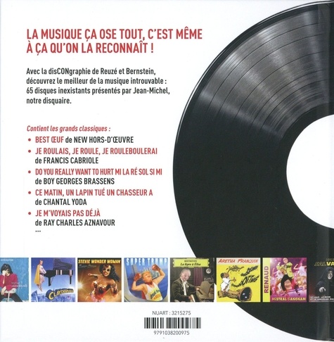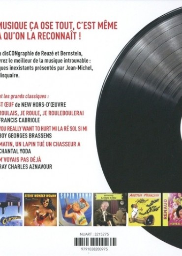 Les gens ont enfin le recueil musical qu'ils méritent ! Avec la disCONgraphie de Reuzé et Bernstein, découvrez le meilleur de la musique du XXIe siècle. Les auteurs ont réalisé ici un énorme travail d'historiens du 4e art et mettent en lumière des albums telles que le "Best Oeuf" de New Hors-D'Oeuvre, le grand classique de la chanson française "Je roulais, je roule, je rouleboulerai" de Francis Cabriole ou encore le très politique "Break First in America" de Super Trump. Ce dernier distille dans cet album des morceaux très courts de moins de 140 caractères, dans lesquels il fustige la world music et les mariachis. Hurlant comme un canard, son chanteur nous pond un album déplorable, qui offre une triste image du rock amérouquin.
