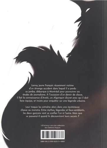 Lenny, jeune Français récemment victime d'un étrange accident dans lequel il a perdu sa jambe, débarque à Montréal pour poursuivre ses études de journalisme. A l'occasion d'un devoir de classe, il fait la connaissance d'Anoki, un Algonquin discret avec qui il doit faire équipe, et insiste pour enquêter sur une légende urbaine. Leur traque les entraîne alors dans une mystérieuse chasse au monstre. Entre mythes, légendes et faux-semblants, les deux garçons vont se confier l'un à l'autre. Mais que se passera-t-il quand ils découvriront leurs secrets ?