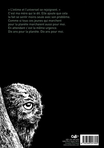 En une centaine de planches en noir et blanc absolument magnifiques, l'autrice Caroline Lamarche et l'illustrateur Paul Mahoux nous racontent les batailles quotidiennes d'une jeune femme atteinte de la mucoviscidose, qui vit intensément chaque jour alors qu'à sa naissance on avait annoncé à ses parents qu'elle ne vivrait pas dix ans. Un récit profond et touchant, qui tisse une réflexion subtile sur la vie et le futur du vivant en général.