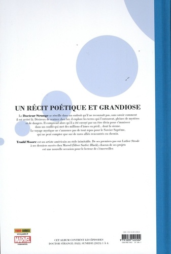 Le Docteur Strange se réveille sur un monde lointain qui n'est pas le sien. Perdu, entouré par de multiples dangers, le Sorcier Suprême tente par tous les moyens d'échapper à cet univers mystérieux. Quel sera le prix à payer ? Nous vous proposons cette aventure inédite du Docteur Strange dans un prestigieux format, et pour cause : elle est écrite et illustrée par l'inimitable Tradd Moore (Silver Surfer : Black). Certainement l'un des chocs visuels de ce début d'année.