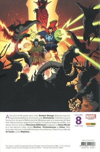 Le monde pense que le Docteur Strange est mort... et cela risque d'être bientôt vrai, car Dormammu veut voler son corps ! L'aide de Cléa et Topaze ne sera pas de trop. Les Nouveaux Défenseurs font leur apparition, Strange prend un nouvel apprenti, et le Baron Mordo attaque. Mais aussi : plongé en Enfer, le Maître des Arts Mystiques doit s'allier à un autre "médecin" : le Docteur Fatalis ! Pour fêter les soixante ans de carrière de Stephen Strange, nous vous proposons cet album articulé autour du superbe récit Triumph & Torment illustré par Mike Mignola, le créateur de Hellboy. Les connaisseurs se rueront sur cet album, particulièrement attirés par les numéros 1 à 13 de la série Doctor Strange de 1988, puisque seulement quatre d'entre eux ont été publiés en France !