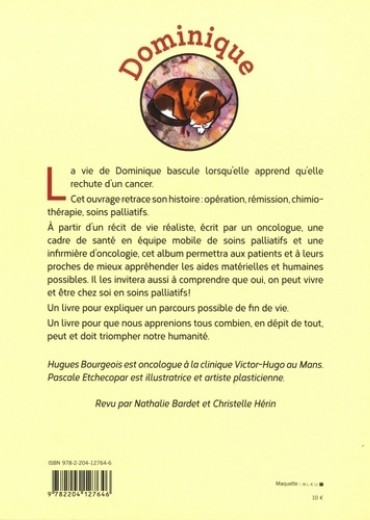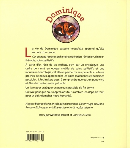 La vie de Dominique bascule lorsqu'elle apprend qu'elle rechute d'un cancer. Cet ouvrage retrace son histoire : opération, rémission, chimiothérapie, soins palliatifs. A partir d'un récit de vie réaliste, écrit par un oncologue, une cadre de santé en équipe mobile de soins palliatifs et une infirmière d'oncologie, cet album permettra aux patients et à leurs proches de mieux appréhender les aides matérielles et humaines possibles. Il les invitera aussi à comprendre que oui, on peut vivre et être chez soi en soins palliatifs ! Un livre pour expliquer un parcours possible de fin de vie. Un livre pour que nous apprenions tous combien, en dépit de tout, peut et doit triompher notre humanité.