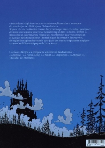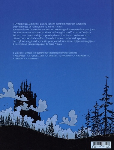 "Dynasties et Magiciens" est une version complémentaire et autonome du premier jeu de rôle Donjon "Clefs en Mains". Reprenez le rôle du Gardien et créez des personnages hauts en couleur pour jouer des aventures fantastiques avec de nouvelles règles dans l'univers "Donjon". Découvrez un système de jeu repensé qui reste familier aux vétérans tout en offrant des possibilités inédites : des techniques de combat et des pouvoirs. des règles de magie et de dynastie. pour jouer des aventures épiques et magiques à travers les différentes époques de Terra Amata. L'univers "Donjon" se compose de sept séries en bande dessinée "Antipodes", "Potron-Minet". "Zénith", "Crépuscule", "Antipodes", "Parade" et "Monsters".