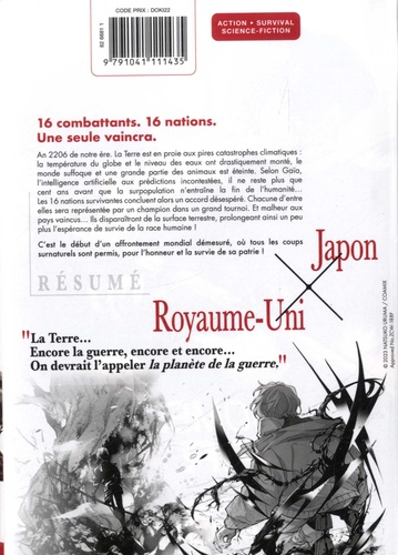 16 combattants. 16 nations. Une seule vaincra. An 2206 de notre ère. La Terre est en proie aux pires catastrophes climatiques : la température du globe et le niveau des eaux ont drastiquement monté, le monde suffoque et une grande partie des animaux est éteinte. Selon Gaïa, l'intelligence artificielle aux prédictions incontestées, il ne reste plus que cent ans avant que la surpopulation n'entraîne la fin de l'humanité... Les 16 nations survivantes concluent alors un accord désespéré. Chacune d'entre elles sera représentée par un champion dans un grand tournoi. Et malheur aux pays vaincus... Ils disparaîtront de la surface terrestre, prolongeant ainsi un peu plus l'espérance de survie de la race humaine ! C'est le début d'un affrontement mondial démesuré, où tous les coups surnaturels sont permis, pour l'honneur et la survie de sa patrie !