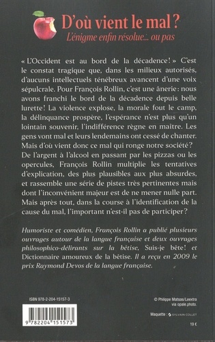 Redoutant une décadence imminente ou même déjà présente, le professeur Rollin cherche courageusement l'origine du mal... Il cherche... Cherche encore... Et ne la trouve pas. En parallèle à sa carrière de comédien, de metteur en scène et de chroniqueur, François Rollin couche désormais sur le papier quelques-unes de ses réflexions essentielles, oscillant entre profondeur et loufoquerie, entre expertise et humour. Fidèle à sa mission, le désormais célèbre professeur Rollin, derrière lequel se dissimule maladroitement le comédien François Rollin, entreprend cette fois d'identifier la cause du mal qui semble ronger notre société déjà au bord du gouffre. De l'argent à l'alcool en passant par la bobinette, l'échelle ou les opercules, il multiplie les tentatives d'explication, des plus plausibles aux plus absurdes, et finit par rassembler une longue série de pistes très pertinentes mais dont l'inconvénient majeur est de ne mener nulle part. Mais, dans la course urgente à l'identification de la cause du mal et subséquemment à son éradication, l'important n'est-il pas de participer ?