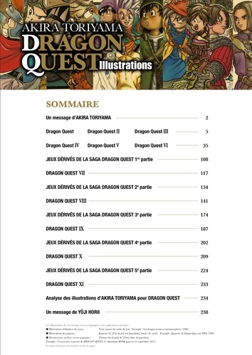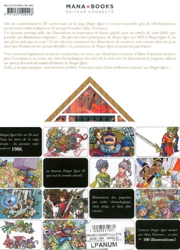 Afin de commémorer le 30e anniversaire de la saga Dragon Quest, ce recueil rassemble plus de 500 illustrations parmi toutes celles réalisées en 30 ans par le maître Akira Toriyama. Un luxueux ouvrage relié, des illustrations en impression de haute qualité pour un rendu vif ; aussi fidèle que possible aux illustrations originales... En plus des titres principaux, de Dragon Quest sur NES à Dragon Quest X, les spin-off ne sont pas en reste ! Cette sélection comprend des illustrations de monstres non retenus dans les jeux ainsi que d'autres encore jamais dévoilées : les amoureux de Dragon Quest ne pourront pas résister. Vous trouverez également un poster comportant, au recto, une illustration exclusive d'Akira Toriyama dessinée pour l'occasion et, au verso, une frise chronologique des titres de la série avec les illustrations de jaquette, offrant un aperçu des trois décennies d'histoire de Dragon Quest. Enfin, à ne pas manquer : une interview d'Akira Toriyama riche d'une confession exclusive sur Dragon Quest...