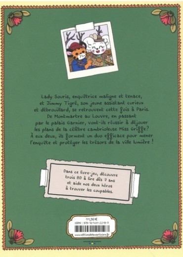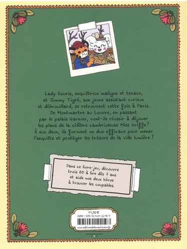 Lady Souris, enquêtrice maligne et tenace, et Jimmy Tigré, son jeune assistant curieux et débrouillard, se retrouvent cette fois á Paris. De Montmartre au Louvre, en passant par le palais Garnier, vont-ils réussir ó déjouer les plans de la célèbre cambrioleuse Miss Griffe ? A eux deux, ils forment un duo efficace pour mener l'enquête et protéger les trésors de la ville lumière ! Dans ce livre-jeu, découvre trois BD á lire dés 7 ans et aide nos deux héros à trouver les coupables.