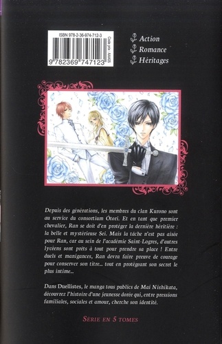 Dans Duellistes, Knight of Flowers , un manga tous publics de Mai Nishikata, découvrez l'histoire d'une jeunesse dorée qui, entre pressions familiale, sociales et amour, cherche son identité ! Avec la sensibilité qui la caractérise, l'autrice met en scène des personnages féminins de caractères ! Depuis des générations, les membres du clan Kurono sont au service du consortium Ôtori. Et en tant que premier chevalier, Ran se doit d'en protéger la dernière héritière : la belle et mystérieuse Sei. Mais la tâche n'est pas aisée pour Ran, car au sein de l'académie Saint-Logres, d'autres lycéens sont prêts à tout pour prendre sa place ! Entre duels et manigances, Ran devra faire preuve de courage pour conserver son titre... tout en protégeant son secret le plus intime...