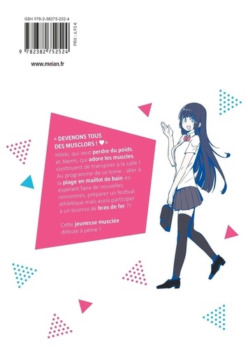 " Devenons tous des musclors ! " Hibiki, qui veut perdre du poids, et Akemi, qui adore les muscles, continuent de transpirer à la salle ! Au programme de ce tome : aller à la plage en maillot de bain en espérant faire de nouvelles rencontres, préparer un festival athlétique mais aussi participer à un tournoi de bras de fer ? ! Cette jeunesse musclée débute à peine !