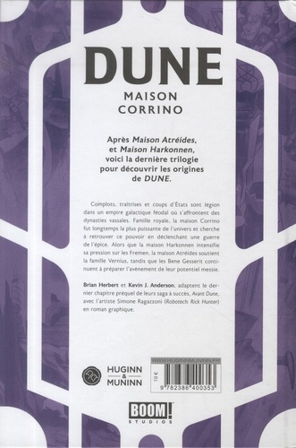 Après Maison Atréides, et Maison Harkonnen, voici la dernière trilogie pour découvrir les origines de DUNE. Complots, traîtrises et coups d'Etats sont légion dans un empire galactique féodal où s'affrontent des dynasties vassales. Famille royale, la maison Corrino fut longtemps la plus puissante de l'univers et cherche à retrouver ce pouvoir en déclenchant une guerre de l'épice. Alors que la maison Harkonnen intensifie sa pression sur les Fremen, la maison Atréides soutient la famille Vernius, tandis que les Bene Gesserit continuent à préparer l'avènement de leur potentiel messie. Brian Herbert et Kevin J. Anderson, adaptent le dernier chapitre préquel de leurs saga à succès, Avant Dune, avec l'artiste Simone Ragazzoni (Robotech : Rick Hunter) en roman graphique.