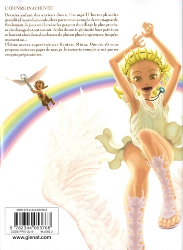 L'oeuvre inachevée Parallèmement à Berserk, Kentaro Miura s'était lancé dans un nouveau projet : créer un nouvel univers fantasy, qui serait dessiné par les artistes qui l'assistent au quotidien, à savoir le studio Gaga. C'est ainsi qu'est né Dur-an-ki, racontant les aventures trépidantes de Usumgall, mi-dieu et mi-humain, mi-homme et mi-femme qui grandit et chasse aux côtés de ses amis humains. Suite au décès de Miura, la série a été arrêtée et ne connaîtra donc pas de fin. Cependant, ce tome inachevé contient le scénario d'origine écrit par Miura, ainsi que toutes ses esquisses et documents préparatoires. De précieux documents qui permettront aux lecteurs de se plonger dans le processus créatif du grand maître.