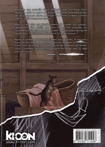 A travers une nouvelle vision partagée avec son frère, Senri découvre enfin le secret que Kazuto souhaitait tellement protéger et comprend mieux pourquoi ce dernier a repris contact avec lui après toutes ces années... Mais, s'il est plus que jamais déterminé à aider son jumeau, l'adolescent n'en oublie pas pour autant son enquête sur l'homme à la cicatrice, et en particulier sur l'imposteur qui se fait passer pour Trois-yeux ! parviendra-t-il à le démasquer ? Après le brillant et touchant Erased, voici Echoes, le nouveau bijou de Kei Sanbe ! Meurtre atroces, mystère et émotions fortes sont au rendez-vous dans ce thriller emprunt de fantastique. Comment résoudre une énigme du passé avec la rage pour seul guide ?