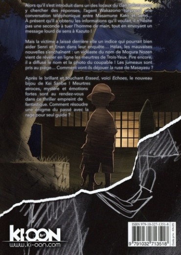 Quand la douleur du passé est le seul chemin vers la vengeance... Alors qu'il s'est introduit dans un des locaux du clan Itakura pour y chercher des réponses, l'agent Wakazono surprend une conversation téléphonique entre Masamune Kato et Senri... A présent qu'il a obtenu les informations qu'il voulait, il n'hésite pas une seconde à tuer l'homme de main, tout en envoyant un message lourd de sens à Kazuto ! Mais la victime a laissé derrière elle un indice qui pourrait bien aider Senri et Enan dans leur enquête... Hélas, les mauvaises nouvelles s'enchaînent : un vidéaste du nom de Mogura Nozen vient de révéler en ligne les meurtres de Trois-Yeux. Pire encore, il a diffusé le nom et la photo du coupable ! Les jumeaux sont pris au piège... Comment vont-ils déjouer la ruse de Masayasu ?