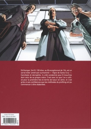 Ed Kemper, 2m10, 130 kilos, au QI exceptionnel de 136, est un serial killer américain surnommé "l'Ogre de Santa Cruz". Cannibale et nécrophile, il a été condamné pour 8 meurtres dont celui de sa propre mère. C'est avec lui que l'on a utilisé pour la première fois le terme de tueur en série, et c'est grâce à ses confidences que les méthodes du profiling ont pu commencer à être élaborées.