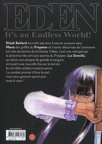 Pour sauver sa soeur Mana des griffes du Propater, Elijah a fait appel aux mercenaires du Colonel Nazarbaïev Khan. Ceux-ci parviennent à accomplir leur mission, mais la hackeuse Sophia tombe aux mains de son ancien amant Jason Lee. Celui-ci tue Mana sous le regard impuissant d'Elijah, qui sombre momentanément dans la drogue avant d'être récupéré par Miriam Arona. Avec Eden, Hiroki Endo propose un manga d'anticipation inspiré du mouvement cyberpunk. Récit à suspense, plein de scènes d'action entraînantes, Eden est violent et cru mais offre aussi certains passages empreints de mélancolie qui ne laissent pas le lecteur insensible. Mélange des genres, ce manga évoque des récits de guerre, le terrorisme, une pandémie... des thèmes ancrés dans notre réalité.