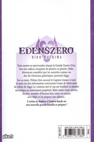 Trois années se sont écoulées depuis la Grande Guerre d'Aoi. Fort des indices récupérés de planète en planète, Shiki, désormais considéré par les autorités comme un des Six Généraux galactiques, poursuit Ziggy. Sur sa route, l'Edens Zero secourt le Captain Connor et met la main sur des informations concernant l'usine de fabrication de robots de Ziggy. Le vaisseau met le cap sur Lendard, la planète mécanique au mouvement perpétuel. Mais contre toute attente, Hawley, membre d'Oracion Seis, entre en contact avec Shiki et lui propose une alliance... L'action se déplace à Cosmos Kaede où une nouvelle grande bataille se prépare !