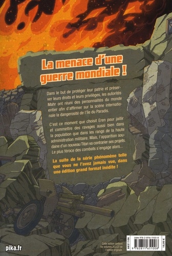 Dans le but de protéger leur patrie et préserver leurs droits et leurs privilèges, les autorités Mahr ont réuni des personnalités du monde entier afin d'affirmer sur la scène internationale la dangerosité de l'île du Paradis. C'est ce moment que choisit Eren pour jaillir et commettre des ravages aussi bien dans la population que dans les rangs de la haute administration militaire. Mais, l'apparition soudaine d'un nouveau Titan va contrarier ses projets. Le plus féroce des combats s'engage alors... Regroupe les volumes 25 à 27 de l'édition standard.