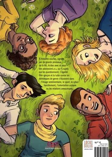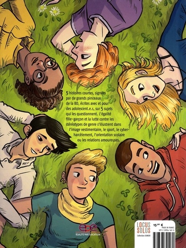 La lutte contre les "stéréotypes de genre" est un thème d'actualité auquel les pouvoirs publics, l'Education Nationale en tête, sont aujourd'hui sensibilisés. En 5 histoires de 10 pages chacune, la BD collective Egaux sans égo amène les ados à se questionner sur les différences de comportement entre les filles et les garçons, les discriminations en général et le harcèlement en particulier. Mais aussi sur les points communs comme le nécessaire respect de soi et de l'autre. 5 histoires pour 5 thèmes : face au sport ; face à l'orientation scolaire et professionnelle ; face aux relations amoureuses ; face aux réseaux sociaux (cyberharcèlement) ; face aux codes vestimentaires (la jupe...). Depuis sa première parution chez Locus Solus, cet album plusieurs fois réimprimé bénéficie d'un partenariat durable avec le centre de ressources de l'Education Nationale, Canopé (fiches pédagogiques et d'activités accessibles en ligne sur https : //egaux-sans-ego-epe. reseau-canope. fr/). Une BD recommandée pour accompagner les enseignants et les adolescents de manière ludique sur cette grande cause nationale qu'est l'égalité femme-homme. Nouvelle édition 2022 : après le succès de la BD vendue à près de 10 000 ex. en 2 versions différentes (2013 et 2018), avec une nouvelle histoire sur le cyberharcèlement, thème traité par l'autrice Cécile Hocquet (Brest). Extrait de presse : "Comment parler d'égalité garçons- filles en restant au plus près du vécu des ados ? En leur donnant la parole. Un ouvrage à glisser dans tous les cartables et à faire passer pour ouvrir la discussion". Enfantipages-Le Monde. fr