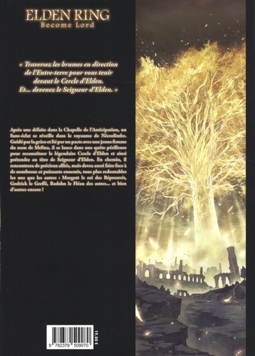 "Traversez les brumes en direction de l'Entre-terre pour vous tenir devant le Cercle d'Elden. Et... devenez le Seigneur d'Elden." Après une défaire dans la Chapelle de l'Anticipation, un Sans-éclat se réveille dans le royaume de Necrolimbe. Guidé par la grâce et lié par un pacte avec une jeune femme du nom de Melina, il se lance dans une quête périlleuse pour reconstituer le légendaire Cercle d'Elden et ainsi prétendre au titre de Seigneur d'Elden. En chemin, il rencontrera de précieux alliés, is devra aussi faire face à de nombreux et puissants ennemis, tous plus redoutables les uns que les autres Morgotr le roi des Réprouvés, Godrick le Greffé, Radahn le Fléau des astres... et bien d'autres encore .