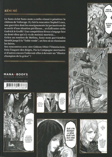 Suivez les aventures loufoques de "Sans-Nom' en Entre-Terre ! Le Sans-éclat Sans-nom a enfin réussi à pénétrer le château de Voilorage. Il y fait la rencontre Nepheli Loux, une guerrière dont les enseignements lui permettront de se sortir d'une situation périlleuse... et d'affronter enfin Godrick le Greffé ! Une compétition féroce s'engage face au demi-dieu qui n'y va de main(s) morte(s)... Grâce au soutien de Melina, Sans-nom parviendra bientôt jusqu'à la "Table ronde', un lieu où se réunissent les héros. Ses rencontres avec sire Gideon Ofnir l'Omniscient, Enia l'augure des doigts, Fia la Compagne mortuaire et d'autres encore l'aideront-elles à devenir un "illustre champion de la grâce' ?
