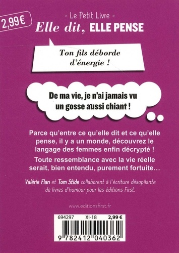 Un petit livre hilarant qui décrypte le langage homme-femme ! Parce qu'entre ce qu'elle dit et ce qu'elle pense, il y a un monde, découvrez le langage des femmes enfin décrypté ! Toute ressemblance avec la vie réelle serait, bien entendu, purement fortuite... Elle dit : Donne-moi ton avis, c'est important. Elle pense : Cause toujours, au final, c'est moi qui déciderai ! Elle dit : J'ai mal à la tête. Elle pense : Encore ? ! Mais on l'a déjà fait ce matin ! Elle dit : Ton fils déborde d'énergie ! Elle pense : De ma vie, je n'ai jamais vi un gosse aussi chiant ! Elle dit : C'est fou toutes ces réunions que tu as au boulot. Elle pense : Tu me prends vraiment pour la reine des connes !