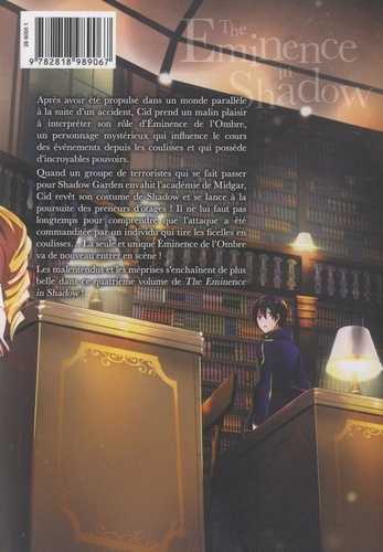 Après avoir été propulsé dans un monde parallèle à la suite d'un accident, Cid prend un malin plaisir à interpréter son rôle d'Eminence de l'Ombre, un personnage mystérieux qui influence le cours des événements depuis les coulisses et qui possède d'incroyables pouvoirs. Quand un groupe de terroristes qui se fait passer pour Shadow Garden envahit l'académie de Midgar, Cid revêt son costume de Shadow et se lance à la t poursuite des preneurs d'otages ! Il ne lui faut pas longtemps pour comprendre que l'attaque a été commanditée-par un individu qui tire les ficelles en coulisses. La seul et unique Eminence de l'Ombre va de nouveau entrer en scène ! Les malentendus et les méprises s'enchaînent de plus belle dans ce quatrième volume de The Eminence in Shadow !