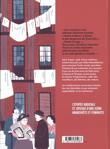 Léa Gauthier et Hélène Aldeguer nous racontent le destin hors norme d'Emma Goldman (1869-1940), activiste et penseuse, grande amoureuse de la vie. Très tôt consciente des injustices du système capitaliste, elle milite toute sa vie pour renverser l'ordre social. Ses exceptionnels talents d'oratrice font vite d'elle une figure mondialement connue de l'anarchisme... et une femme considérée comme la plus dangereuse des Etats-Unis ! Accusée d'incitation à l'émeute, opposée à la conscription lors de la Grande guerre, promouvant la contraception et l'avortement, elle est de nombreuses fois emprisonnée. Déchue de sa nationalité, exilée en Russie lors de la Révolution bolchévique, elle dénonce rapidement les dérives du communisme soviétique... A travers ce récit, c'est une féministe libertaire d'une incroyable modernité qui se dessine, prônant l'union libre, le droit au plaisir et l'émancipation de tous et des femmes en particulier. Léa Gauthier est philosophe de l'art et traductrice d'une dizaine de textes emblématiques de l'anarchisme. Son récit est librement adapté de Living my life, l'autobiographie d'Emma Goldman. Elle s'allie ici avec Hélène Aldeguer, qui nous plonge avec brio dans l'ébullition politique mondiale du tournant du XX ? siècle : essor du capitalisme américain, Première Guerre mondiale et Révolution russe.