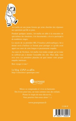 Art-mella est une jeune femme qui aime chercher des réponses aux questions qu'elle se pose. Pendant quelques années, Art-mella est allée à la rencontre de spécialistes des émotions, s'est documentée, a lu et a participé à de nombreux stages. Le succès de sa première BD. Friandises philosophiques, lui a donné envie d'utiliser ce format pour partager ce qu'elle avait appris au cours de cette longue et passionnante enquête. Au cours de l'écriture, Art-mella s'est rendu compte qu'un tome ne suffirait pas à donner l'ensemble des clés. Mais déjà, vous avez avec ces premières planches de quoi mener votre propre enquête intérieure. Bon voyage à vous !