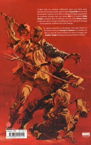 A New York, les zombies s'affrontent dans une arène pour distraire les humains tandis que le maire Chandrake et son clan de vampires règnent sur la ville. Le dirigeant brigue aujourd'hui un nouveau mandat mais son neveu Bill et le virulent Chilly Dobbs comptent bien le détrôner. De son côté, Penny Jones étudie des morts-vivants à l'intelligence hors norme et s'occupe d'une patiente souffrant d'un mal étrange... Ce volume présente la deuxième mini-série Empire of the Dead, écrite par George A. Romero (le créateur du film La nuit des morts-vivants) et mise en images par Dalibor Talajic (Deadpool massacre Marvel, Dexter).