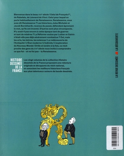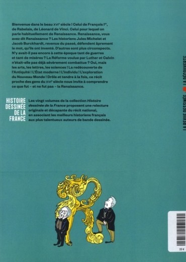 Bienvenue dans le beau xvie siècle ! Celui de François Ier, de Léonard de Vinci, de la culture humaniste, des arts, des lettres et des sciences, de la formation de l'Etat moderne, de l'affirmation de l'individu, de l'exploration du Nouveau Monde et de la réforme de l'Eglise. Les historiens Jules Michelet et Jacob Burckhardt, revenus du passé, nous emmènent à la découverte de la Renaissance, période durant laquelle la France connaît une véritable révolution culturelle en s'inspirant de l'Antiquité dans tous les arts - architecture, peinture, sculpture, musique ou arts décoratifs. C'est aussi un moment faste pour le monde des lettres, qui se transforme profondément grâce à la nouvelle approche critique des textes qu'est l'humanisme et au rôle immense que l'imprimerie joue dans l'accès au savoir. Le Gargantua de François Rabelais en est un exemple édifiant. Ce monde dans lequel les idées nouvelles circulent est celui de l'échange, des voyages, du commerce et des banquiers. A l'époque où commencent les grandes explorations par-delà les océans, la France tout entière s'enrichit, confirmant la puissance et l'autorité royales. C'est que la dynastie des Valois a renforcé l'Etat en s'entourant d'une administration puissante capable de lever l'impôt et de régler les problèmes juridiques. Mais c'est un temps encore marqué par les famines, les innombrables guerres d'Italie et plus généralement entre Etats d'Europe, une forte censure liée à la fracture religieuse qui s'impose à partir des premiers écrits des théologiens Martin Luther et Jean Calvin appelant à la réforme de l'Eglise catholique, et des exactions violentes contre leurs partisans, annonçant la période sombre des guerres de religion.