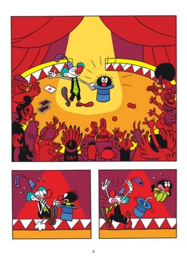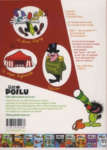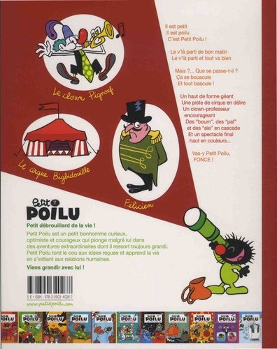 Il est petit. II est poilu. C'est Petit Poilu ! Le v'là parti de bon matin Le v'là parti et tout va bien. Mais ?... Que se passe-t-il ? Ca se bouscule Et tout bascule ! Un haut de forme géant. Une piste de cirque en délire. Un clown-professeur encourageant. Des "boum", des "paf" et des "aie" en cascade. Et un spectacle final haut en couleurs... Vas-y Petit Poilu, Fonce !