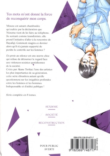 Tes mots m'ont donné la force de reconquérir mon corps. Misuzu est autant chamboulée qu'exaltée par la déclaration que Niizuma vient de lui faire au téléphone. Se sentant comme transformée, elle prend l'initiative d'aller à la rencontre de Hayafuji. Comment réagira ce dernier alors qu'il n'a jamais supporté de perdre le contrôle sur les femmes ? En proie au silence est une oeuvre choc qui refuse de détourner le regard face aux violences sexistes quotidiennes de la société. Créée par Akane Torikai, l'une des artistes les plus importantes de sa génération, cette série ébranlera autant qu'elle questionnera sur les inégalités profondes entre les femmes et les hommes. Indispensable et d'utilité publique !