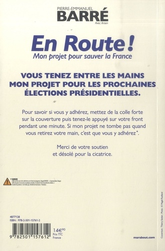 Vous tenez entre les mains mon projet pour les prochaines élections présidentielles. Pour savoir si vous y adhérez, mettez de la colle forte sur la couverture puis tenez-le appuyé sur votre front pendant une minute. Si mon projet ne tombe pas quand vous retirez votre main, c'est que vous y adhérez. Merci de votre soutien et désolé pour la cicatrice.