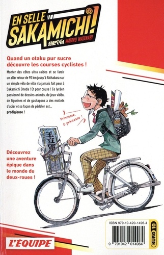La victoire est à un coup de pédalier ! Un manga culte co-édité avec l'Equipe ! Quand un otaku pur sucre découvre les courses cyclistes ! Monter des côtes ultra raides et se farcir un aller et retour de 90 km jusqu'à Akihabara sur un simple vélo de ville n'a jamais fait peur à Sakamichi Onoda ! Et pour cause ! Ce lycéen passionné de dessins animés, de jeux vidéo, de figurines et de gashapons a des mollets d'acier et il sa façon de pédaler est... Prodigieuse ! Découvrez une grande aventure épique dans le monde du deux-roues !