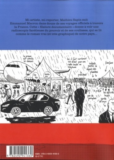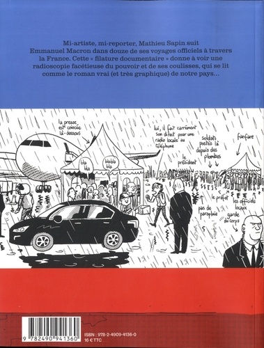 Mi-artiste, mi-reporter, Mathieu Sapin suit Emmanuel Macron dans douze de ses voyages officiels à travers la France. Cette " filature documentaire" donne à voir une radioscopie facétieuse du pouvoir et de ses coulisses, qui se lit comme le roman vrai (et très graphique) de notre pays...
