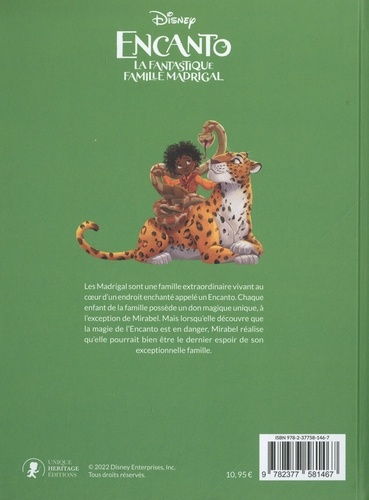 Retrouvez l'histoire du film Disney Encanto - La Fantastique Famille Madrigal dans une magnifique bande dessinée ! Ce livre de 56 pages comprend une présentation des personnages, des citations du film et l'histoire complète au format BD. A lire dès 7 ans. Les Madrigal sont une famille extraordinaire vivant au coeur d'un endroit enchanté appelé un Encanto. Chaque enfant de la famille possède un don magique unique - allant d'une force surhumaine au pouvoir de guérison - à l'exception de Mirabel. Mais lorsqu'elle découvre que la magie de l'Encanto est en danger, Mirabel réalise qu'elle pourrait bien être le dernier espoir de son exceptionnelle famille.
