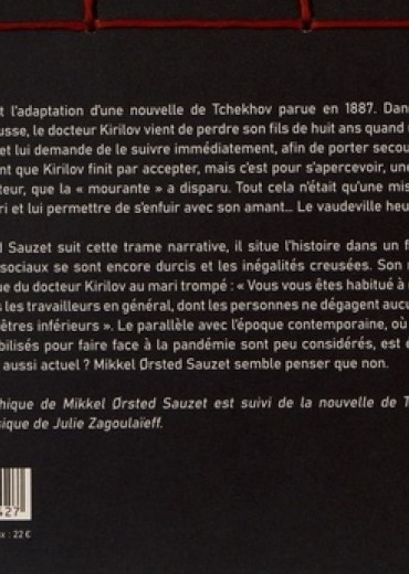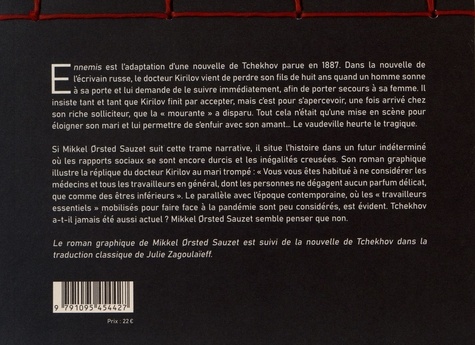 Ennemis est l'adaptation d'une nouvelle de Tchekhov parue en 1887. Dans la nouvelle de l'écrivain russe, le docteur Kirilov vient de perdre son fils de huit ans quand un homme sonne à sa porte et lui demande de le suivre immédiatement, afin de porter secours à sa femme. Il insiste tant et tant que Kirilov finit par accepter, mais c'est pour s'apercevoir, une fois arrivé chez son riche solliciteur, que la " mourante " a disparu. Tout cela n'était qu'une mise en scène pour éloigner son mari et lui permettre de s'enfuir avec son amant... Le vaudeville heurte le tragique. Si Mikkel Orsted Sauzet suit cette trame narrative, il situe l'histoire dans un futur indéterminé où les rapports sociaux se sont encore durcis et les inégalités creusées. Son roman graphique illustre la réplique du docteur Kiritov au mari trompé : " Vous vous êtes habitué à ne considérer les médecins et tous les travailleurs en général, dont les personnes ne dégagent aucun parfum délicat, que comme des êtres inférieurs ". Le parallèle avec l'époque contemporaine, où les " travailleurs essentiels " mobilisés pour faire face à la pandémie sont peu considérés, est évident. Tchekhov a-t-il jamais été aussi actuel ? Mikkel Orsted Sauzet semble penser que non.