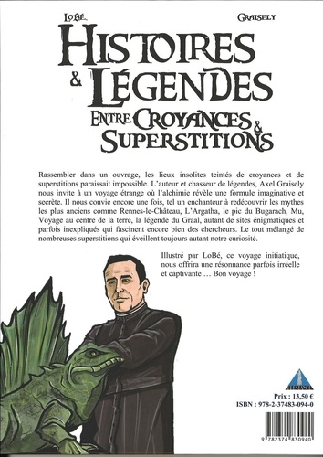 Rassembler dans un ouvrage, les lieux insolites teintés de croyances et de superstitions paraissait impossible. L'auteur et chasseur de Légendes, Axel Graisely nous invite à un voyage étrange où l'alchimie révèle une formule imaginaire et secrète. Il nous convie encore une fois, tel un enchanteur à redécouvrir les mythes les plus anciens comme Rennes-le-Château, l'Argatha, le pic du Bugarach, Mu, Voyage au centre de la terre, la légende du Graal, autant de sites énigmatiques et parfois inexpliqués qui fascinent encore bien des chercheurs. Le tout mélangé de nombreuses superstitions qui éveillent toujours autant la curiosité. Illustré par LoBé, ce voyage initiatique, nous offrira une résonnance parfois irréelle et captivante... Bon voyage !