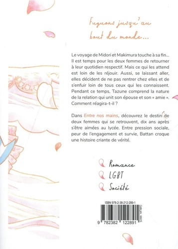 Dans Entre nos mains, découvrez le destin de deux femmes qui se retrouvent, dix ans après s'être aimées au lycée. Entre pression sociale, peur de l'engagement et survie, Battan croque une histoire criante de vérité. Le voyage de Midori et Makimura touche à sa fin... Il est temps pour les deux femmes de retourner à leur quotidien respectif. Mais ce qui les attend est loin de les réjouir. Aussi, se laissant aller, elles décident de ne pas rentrer chez elles et de s'enfuir loin de tous ceux qui les connaissent. Pendant ce temps, Tazune comprend la nature de la relation qui unit son épouse et son " amie ". Comment réagira-t-il ?
