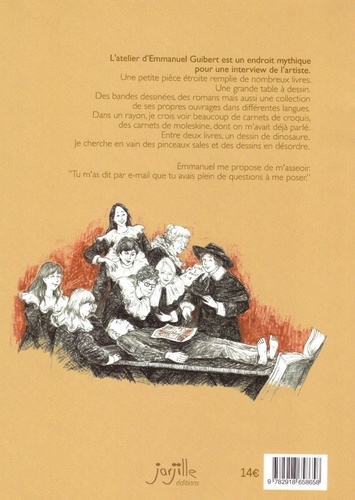 L'atelier d'Emmanuel Guibert est un endroit mythique pour une interview de l'artiste. Une petite pièce étroite remplie de nombreux livres. Une grande table à dessin. Des bandes dessinées, des romans mais aussi une collection de ses propres ouvrages dans différentes langues. Dans un rayon, je crois voir beaucoup de carnets de croquis, des carnets de moleskine, dont on m'avait déjà parlé. Entre deux livres, un dessin de dinosaure. Je cherche en vain des pinceaux sales et des dessins en désordre. Emmanuel me propose de m'asseoir. "Tu m'as dit par e-mail que tu avais plein de questions à me poser"