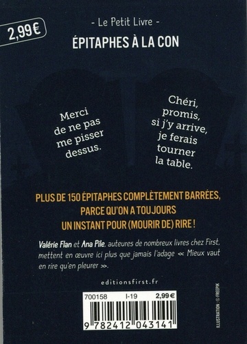 Plus de 150 épitaphes complétement barrées, parce qu'on a toujours un instant pour (mourir de) rire ! Valérie Flan et Ana Pile, auteures de nombreux livres chez First, mettent en oeuvre ici plus que jamais l'adage "Mieux vaut en rire qu'en pleurer".