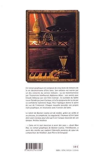 Ce roman graphique est composé de cinq récits de témoins de la vie déconcertante d'Erik Satie. Son enfance est narrée par un des conscrits du service militaire ; sa vie montmartroise par l'humoriste honfleurais Alphonse Allais ; son amitié avec Claude Debussy par son frère Conrad ; le scandale du ballet russe Parade par Jean Cocteau, et la fin poignante de sa vie par sa confidente Valentine Hugo. Puis l'épilogue donne le point de vue de l'intéressé. Chaque nouvelle possède son propre style graphique, en résonance avec l'univers de Satie.