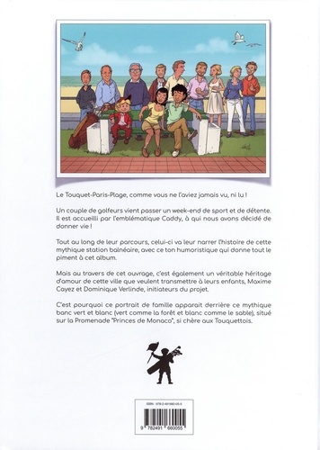 Le Touquet-Paris-Plage, comme vous ne l'aviez jamais vu, ni lu ! Un couple de golfeurs vient passer un week-end de sport et de détente. Il est accueilli par l'emblématique Caddy, à qui nous avons décidé de donner vie ! Tout au long de leur parcours, celui-ci va leur narrer l'histoire de cette mythique station balnéaire, avec ce ton humoristique qui donne tout le piment à cet album. Mais ou travers de cet ouvrage, c'est également un véritable héritage d'amour de cette ville que veulent transmettre à leurs enfants, Maxime Cayez et Dominique Verlinde, initiateurs du projet. C'est pourquoi ce portrait de famille apparait derrière ce mythique banc vert et blanc (vert comme la forêt et blanc comme le sable), situé sur la Promenade "Princes de Monaco", si chère aux Touquettois.