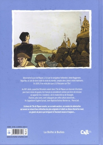 Découverte le jour de Pâques 1722 par le navigateur hollandais Jakob Roggeveen, Rapa Nui, ce coin de terre isolé du reste du monde, compte alors 3 000 à 4 000 habitants. En 1876, il ne reste plus que 175 Pascuans sur l'île ! Au XIXe siècle, quand les Péruviens voient dans l'île de Pâques un réservoir d'esclaves pour leurs mines de guano, les Français la considèrent comme une terre de mission où apporter les "lumières" de la modernité ou de l'évangile. D'autres, plus rares, sont subjugués par cette culture ancestrale... Ils s'appelaient Eugène Eyraud, Jean-Baptiste Dutrou-Bornier ou... Pierre Loti. Esclaves de l'île de Pâques raconte, sur un mode western, ces années de colonisation qui auront eu raison d'une civilisation des plus originales et réduit au silence éternel les moaï, ces géants de pierre qui intriguent et fascinent encore et toujours...