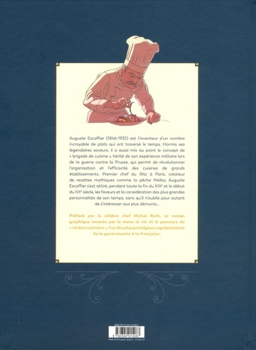 Auguste Escoffier (1846-1935) est l'inventeur d'un nombre incroyable de plats qui ont traversé le temps. Hormis ses légendaires saveurs, il a aussi mis au point le concept de "brigade de cuisine", hérité de son expérience militaire lors de la guerre contre la Prusse, qui permit de révolutionner l'organisation et l'efficacité des cuisines de grands établissements. Premier chef du Ritz à Paris, créateur de recettes mythiques comme la pêche Melba, Auguste Escoffier s'est attiré, pendant toute la fin du XIXe et le début du XXe siècle, les faveurs et la considération des plus grandes personnalités de son temps, sans qu'il n'oublie pour autant de s'intéresser aux plus démunis... Préfacé par le célèbre chef Michel Roth, ce roman graphique raconte par le menu la vie et le parcours du "roi des cuisiniers", l'un des plus prestigieux représentants de la gastronomie à la française.