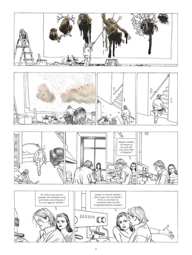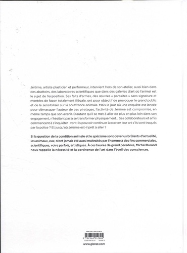 Le plus sauvage des animaux, c'est l'homme Jérôme, artiste plasticien et performeur, intervient hors de son atelier, aussi bien dans des abattoirs, des laboratoires scientifiques que dans des galeries d'art où l'animal est le sujet de l'exposition. Ses faits d'armes, des oeuvres " parasites " sans signature et montées de façon totalement illégale, ont pour objectif de provoquer le grand public et le sensibiliser sur la souffrance animale. Mais le jour où une enquête est lancée pour démasquer l'auteur de ces piratages, l'activité de Jérôme est compromise, en même temps que son avenir. D'autant qu'il se met à aller de plus en plus loin dans son engagement, n'hésitant pas à se transformer physiquement... Ses collaborateurs et amis commencent à s'inquiéter : vont-ils pouvoir continuer à exercer leur art s'ils sont traqués par la police ? Et jusqu'où Jérôme est-il prêt à aller ? Si la question de la condition animale et le spécisme sont devenus brulants d'actualité, les animaux, eux, n'ont jamais été aussi maltraités par l'homme à des fins commerciales, scientifiques, voire artistiques. A ces heures de grand paradoxe, Michel Durand offre un album salutaire qui livre par la même une réflexion puissante sur le rôle et les limites de l'art dans l'éveil des consciences.
